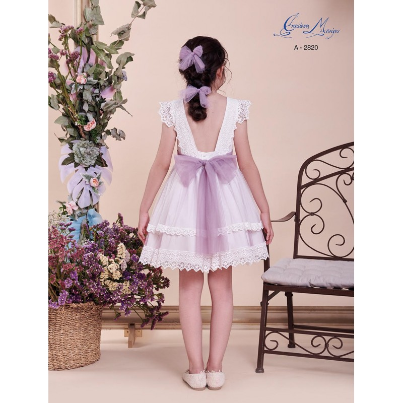 Vestido renda / tule e aplique flor c/ laço nas costas