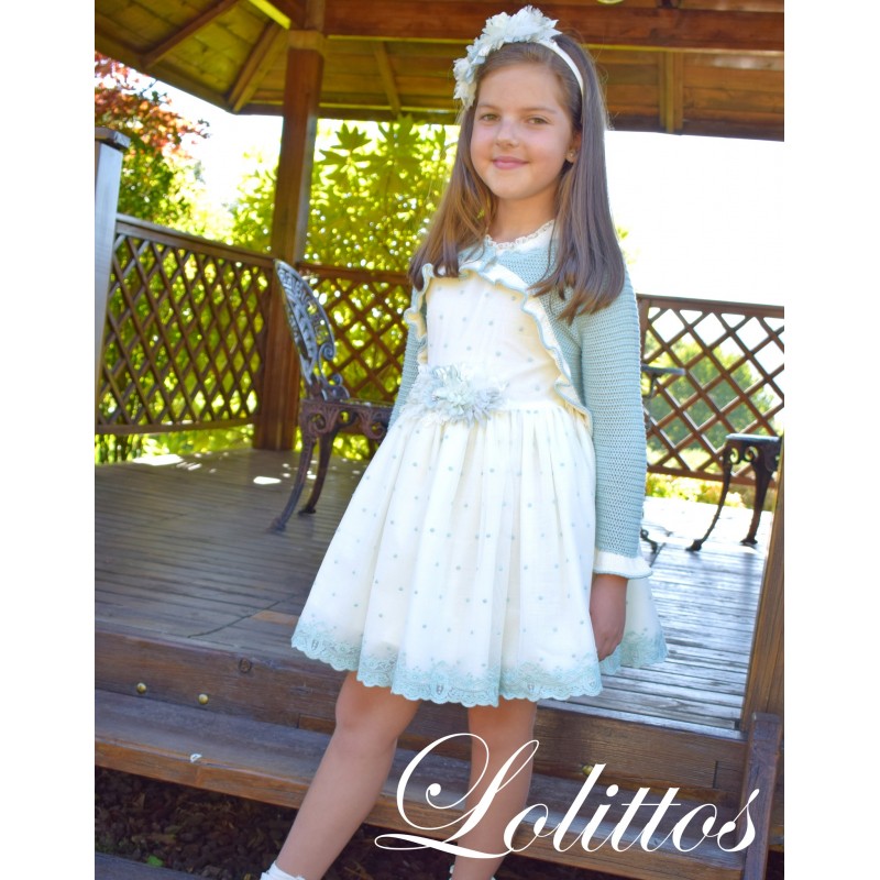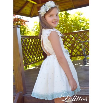 Vestido renda / tule e aplique flor c/ laço nas costas
